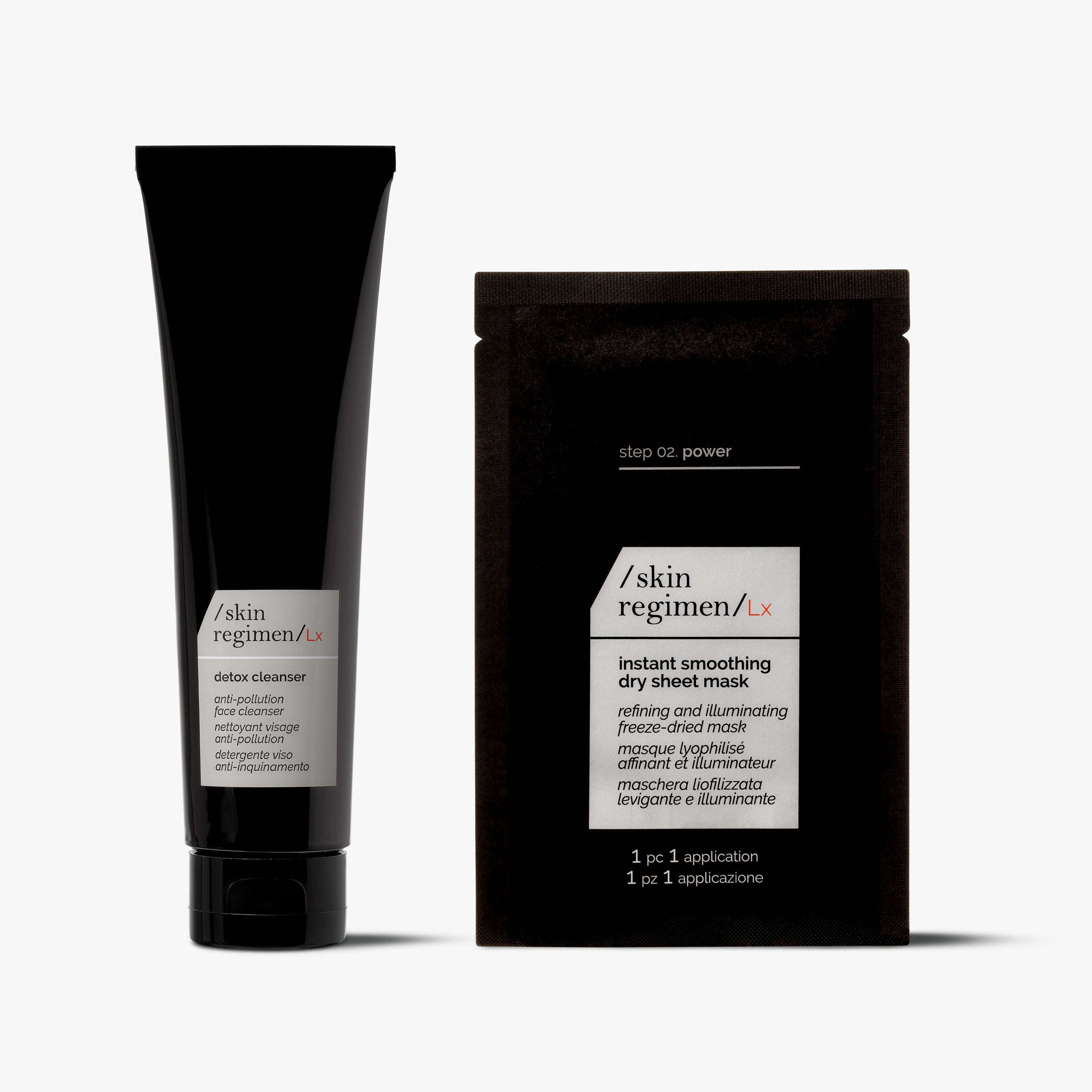 SKIN REGIMEN LX DETOX CLEANSER 150ML: Aqua / Water / Eau*, Glycerin*, Sodium Cocoyl Isethionate, Betaine*, Stearic Acid*, Glyceryl Stearate Citrate*, Pentylene Glycol*, Decyl Glucoside*, Disodium Cocoamphodiacetate, Sodium Lauroyl Glutamate*, Juniperus Virginiana Oil*, Sclerotium Gum*, Butylene Glycol*, Chlorphenesin, Polyquaternium-10, Juniperus Communis Fruit Oil*, Spinacia Oleracea Leaf Extract / Spinacia Oleracea (Spinach) Leaf Extract*, Propanediol*, Myrtus Communis Extract*, Carnosine, Coriandrum Sativum Seed Oil / Coriandrum Sativum (Coriander) Seed Oil*, Citric Acid*, Cedrus Atlantica Oil/Extract*, Pelargonium Graveolens Flower Oil*, Tephrosia Purpurea Seed Extract*, Elettaria Cardamomum Seed Extract*, Sodium Benzoate, Jasmine Oil/Extract*, Potassium Sorbate, Beta-Caryophyllene*, Linalool*. SKIN REGIMEN LX INSTANT SMOOTHING DRY SHEET MASK: GLYCERIN, BUTYLENE GLYCOL, BETAINE, AQUA / WATER / EAU, NIACINAMIDE, PANTHENOL, SODIUM HYALURONATE, XANTHAN GUM, PENTYLENE GLYCOL, 1,2-HEXANEDIOL, PINUS SYLVESTRIS LEAF EXTRACT, DIPROPYLENE GLYCOL, HYDROXYACETOPHENONE, ILLICIUM VERUM FRUIT EXTRACT / ILLICIUM VERUM (ANISE) FRUIT EXTRACT, CAPRYLYL GLYCOL, CITRIC ACID, SCUTELLARIA BAICALENSIS ROOT EXTRACT, SODIUM CITRATE, CHENOPODIUM QUINOA SEED EXTRACT, DAUCUS CAROTA SATIVA ROOT EXTRACT / DAUCUS CAROTA SATIVA (CARROT) ROOT EXTRACT, GLYCINE MAX SEED EXTRACT / GLYCINE MAX (SOYBEAN) SEED EXTRACT, ORYZA SATIVA EXTRACT / ORYZA SATIVA (RICE) EXTRACT, PANAX GINSENG ROOT EXTRACT, DIPOTASSIUM GLYCYRRHIZATE